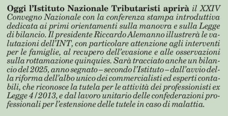 Alemanno (tributaristi INT) Il riconoscimento della Legge 4/2013 funziona - Da Il Sole 24 Ore del 20.11.2025 XXIV Convegno Nazionale INT - 20/11/25 Italia Oggi