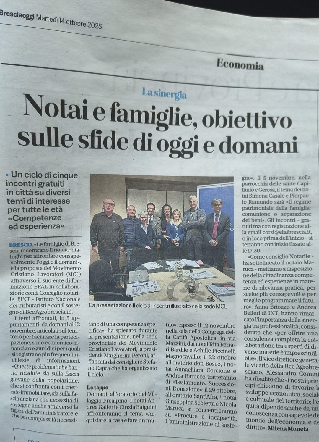 La Delegazione di Brescia, a cura del Delegato Provinciale Andrea Belleri e del Tributarista Stefano Capra, ha organizzato delle giornate di studio in presenza dal titolo "Le famiglie di Brescia incontrano il notaio" - Dialoghi per affrontare consapevolmente l'oggi e il domani.