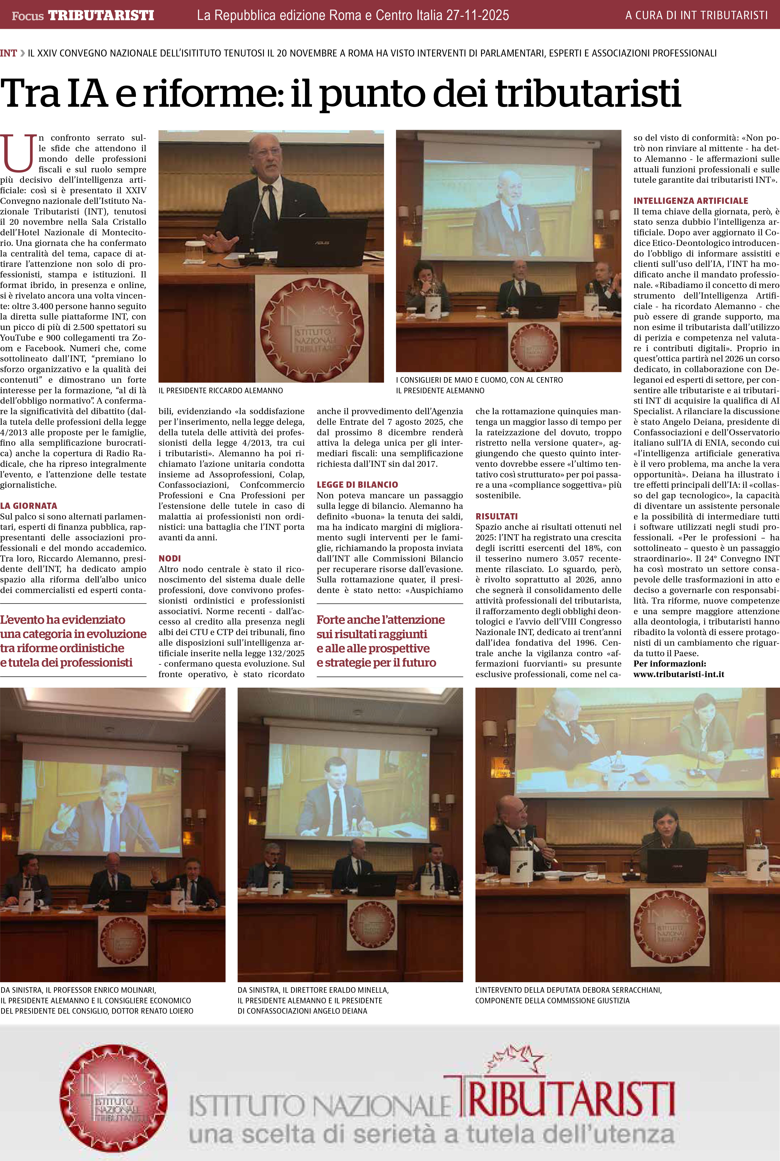 Il XXIV Convegno Nazionale è stato qualcosa di veramente speciale, il format in presenza, presso la Sala Cristallo dell'Hotel Nazionale di Montecitorio, e in streaming tramite il canale YouTube INT, la piattaforma zoom e la pagina facebook INT, è risultato vincente, con oltre 3.400 persone che hanno seguito on line l’evento. Molto apprezzati gli interventi dei vari relatori e ospiti che ringraziamo, così come ringraziamo i tributaristi e le tributariste, le testate giornalistiche in presenza e tutti coloro collegati alla diretta streaming. Proprio in quest'ultima modalità di partecipazione si è verificato qualcosa di inaspettato e di grandioso: oltre 3.400 presenze, con il canale Youtube che ha raggiunto più di 2.500 spettatori e 900 sono stati i collegamenti sulle altre piattaforme. Un grande grazie, pertanto, a chi ha seguito il Convegno tramite la diretta streaming. Numeri che premiano lo sforzo organizzativo e la qualità dei contenuti e che certificano l'attenzione dei tributaristi e delle tributariste dell'INT alla formazione e all' aggiornamento, al di là dell'obbligo normativo, ma anche un'attenzione della stampa alle nostre proposte e alla tutela della figura professionale del tributarista. Numeri che devono rendere orgogliosi i tributaristi dell’Istituto nazionale Tributaristi.