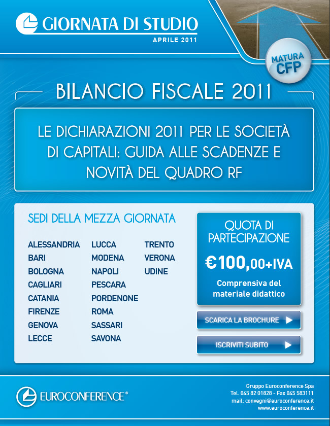 La informiamo, inoltre, che nella predisposizione e preliminarmente all'invio dell' allegato sono stati effettuati tutti i possibili controlli tecnici per verificare che i files siano indenni da virus. In ogni caso, si declina ogni responsabilità in ordine alla trasmissione delle e-mail. L'installazione di un'applicazione antivirus aggiornata rientra comunque tra le regole di una corretta utilizzazione di qualsiasi sistema informatico. Qualora non fosse interessato a ricevere le nostre informative, Le chiediamo cortesemente di comunicarlo tramite posta elettronica al seguente indirizzo: privacy@euroconference.it unitamente alla specifica indicazione della mail su cui riceve le nostre Informative al fine di poter depennare il Suo nominativo