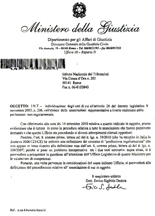 A Settembre il Presidente dell'INT, Riccardo Alemanno, aveva scritto al Ministero della Giustizia per avere notizie certe circa lo stato della pratica relativa all' art. 26 del D.Lgs. 206/2007 di recepimento della Direttiva comunitaria 2005/36/Ce (qualifiche professionali) ai fini dell’ammissione dell'INT alle Conferenze dei servizi per la definizione delle piattaforme comuni a livello europeo. Alemanno aveva scritto chiedendo semplicemente un risposta chiarificatrice da parte del Dicastero titolare del procedimento . Nei giorni scorsi è giunta al Presidente dell'INT la risposta del Ministero. " Nessun ritardo strumentale sulla procedura " dichiara Alemanno dopo avere letto la lettera della Giustizia, e precisa " una legittima verifica circa alcune presunte incongruenze tra i Decreti di recepimento della Direttiva qualifiche e della Direttiva servizi. L'importante è che il Ministero valuti la problematica senza tener conto delle congetture poste in essere da rappresentanti di ordini professionali, perchè come ribadito nella Conferenza interministeriale dei servizi proprio in tema di Direttiva qualifiche ordini ed associazioni sono organizzazioni differenti che rappresentano differenti soggetti professionali, ciascuno con proprie peculiarità ed esigenze. Sono peraltro lieto che alcune Associazioni del Colap abbiano già ottenuto il Decreto di inserimento nelel piattaforme, circa i tributaristi ho fiducia nella professionalità dell'Ufficio Legislativo del Ministero a cui è stata demandata la verifica dal punto di vista giuridico".