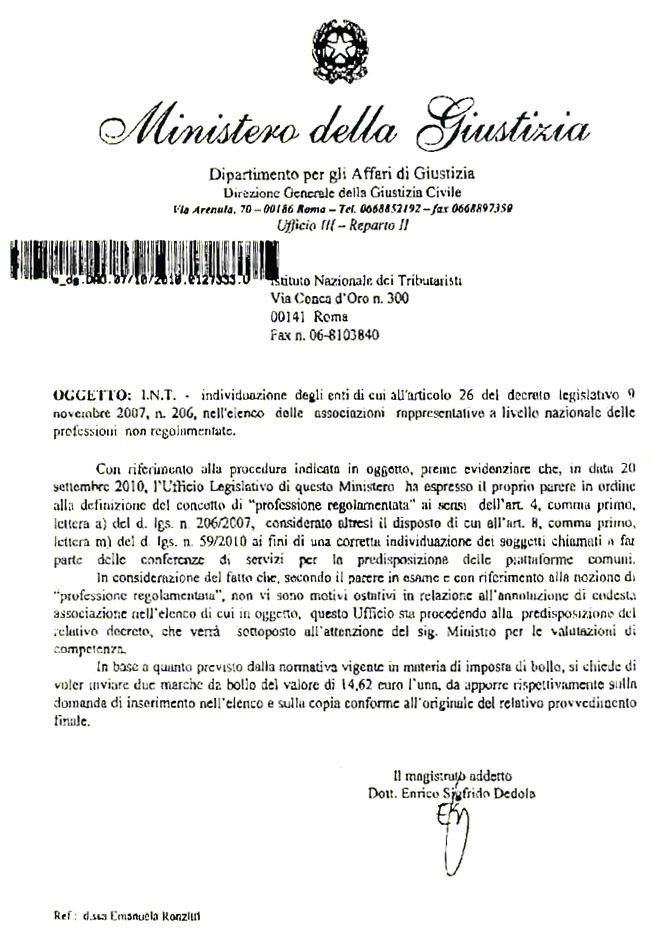 Dopo che nei giorni scorsi è giunta all'Istituto Nazionale Tributaristi (INT) una prima nota del Ministero della Giustizia sul procedimento realtivo al D.Lgs. 206/2007 (Direttiva qualifiche), lo scorso 7 ottobre un secondo fax annunciava che l'Ufficio Legislativo dello stesso Dicastero aveva dato parere favorevole al Decreto per l'inserimento dell'INT nell'elenco dei soggetti che potranno partecipare alle piattaforme europee (Decreto che peraltro è ancora alla firma del Ministro).
